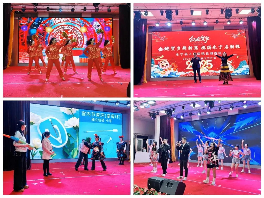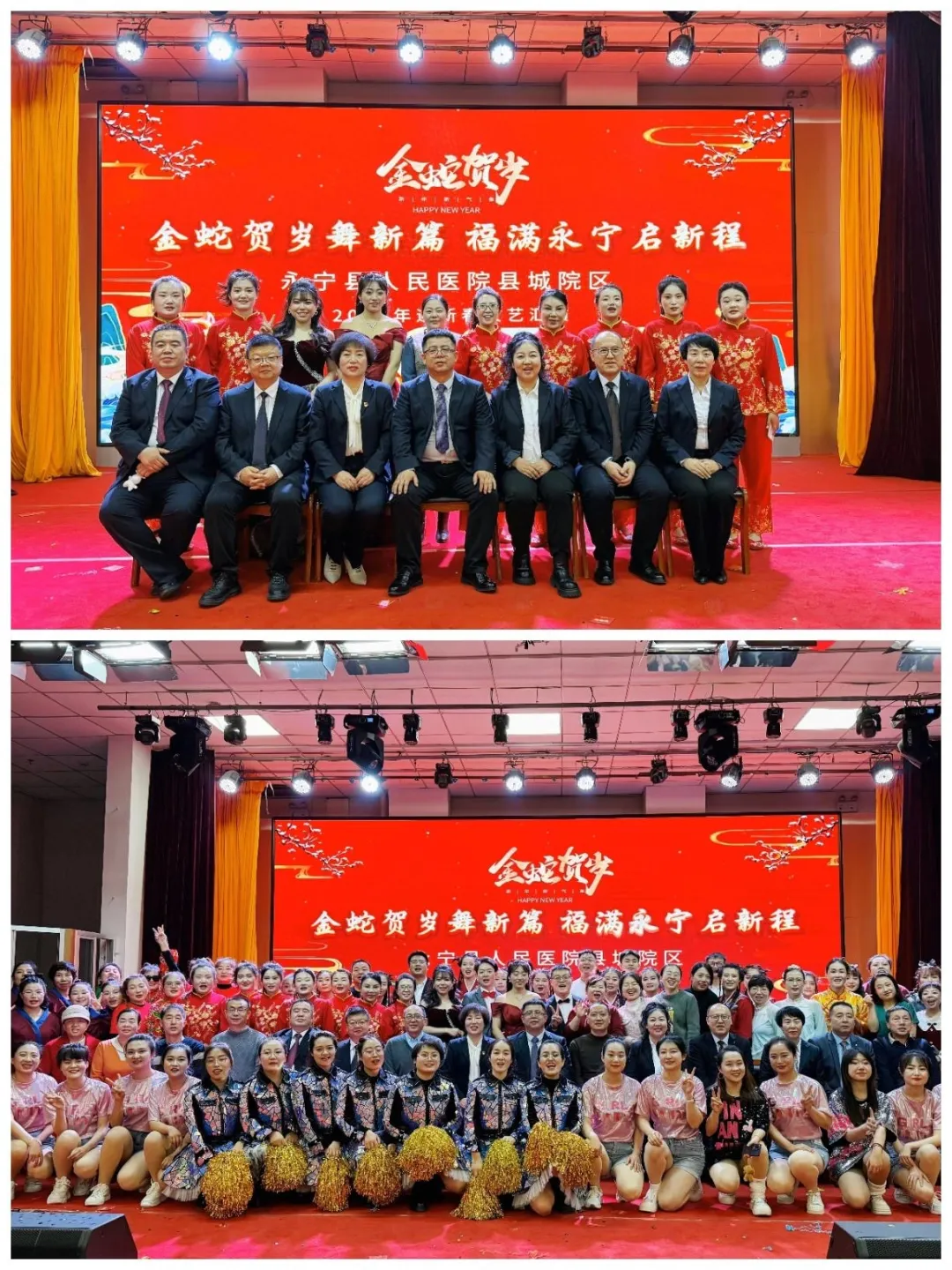 金蛇纳福,喜溢永宁,温馨满座话团圆;春风送暖,情谊绵绵,笑语欢声庆华年。2025年1月26日,永宁县人民医院县城院区“金蛇贺岁舞新篇 福满永宁启新程”——2025年迎新春联欢会在翘首以盼中如约而至。永宁县人民医院县城院区领导班子及200余名职工欢聚一堂,共同奏响2025年的激昂序曲。