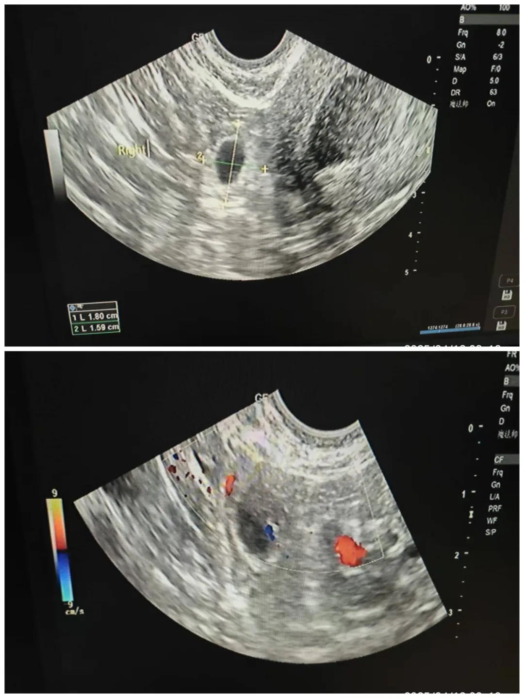 检查过程中,医生们如侦探般抽丝剥茧,在错综复杂的影像中发现关键线索:子宫虽外形饱满、肌层回声均匀,但宫腔内出现约4.3x2.1cm的不规则无回声区域,节育器强回声位置偏移;宫颈处可见直径约0.6cm的囊性结节;而右侧卵巢上方的1.8x1.6cm混合回声包块更是“暗藏玄机”,其中1.5x1.4cm的囊性回声内,卵黄囊、直径约0.3cm的胎芽组织以及心管搏动清晰可见。凭借深厚的专业知识与丰富的临床经验,功能科团队当即做出精准判断——宫外孕(右侧),同时提示宫腔积血合并节育器嵌顿。