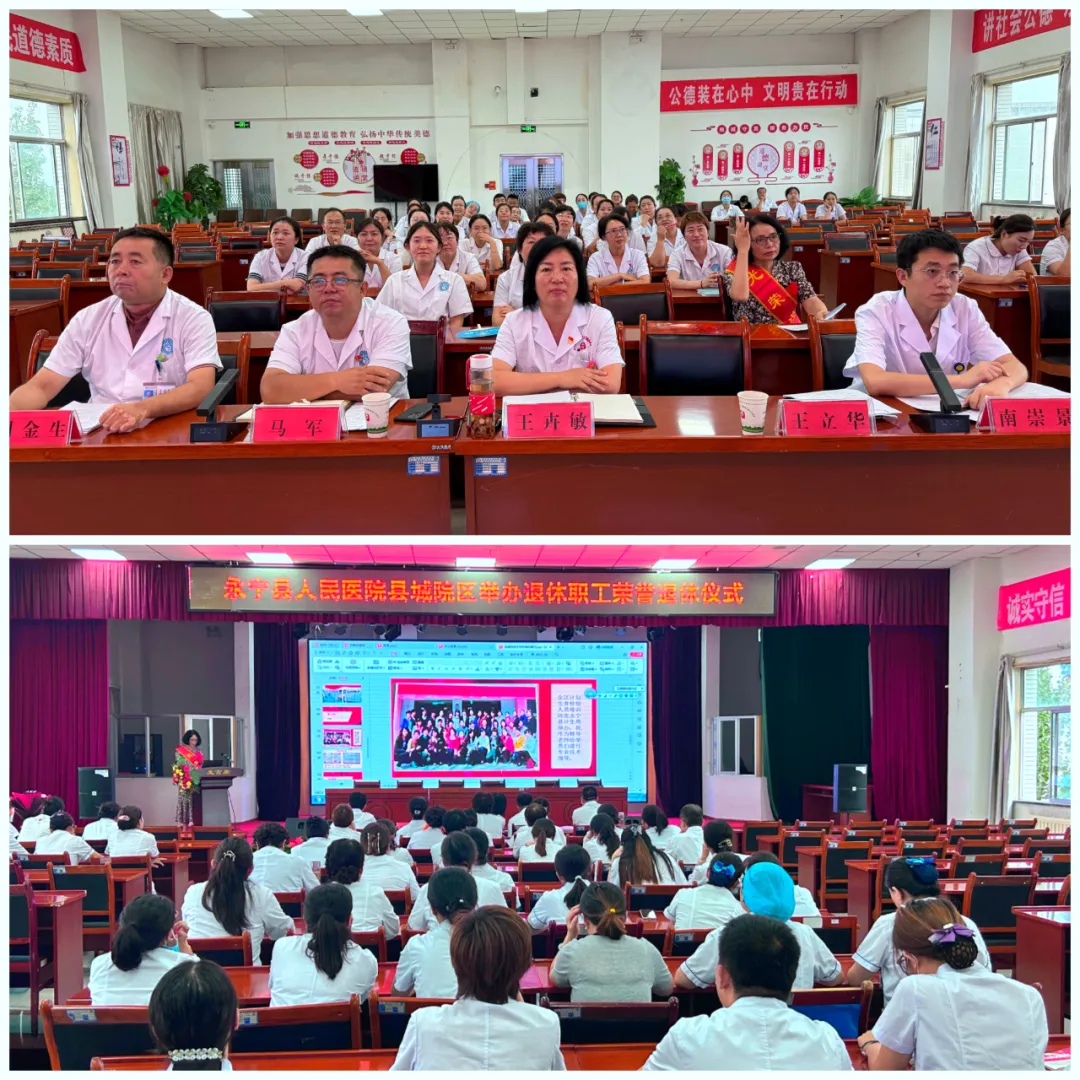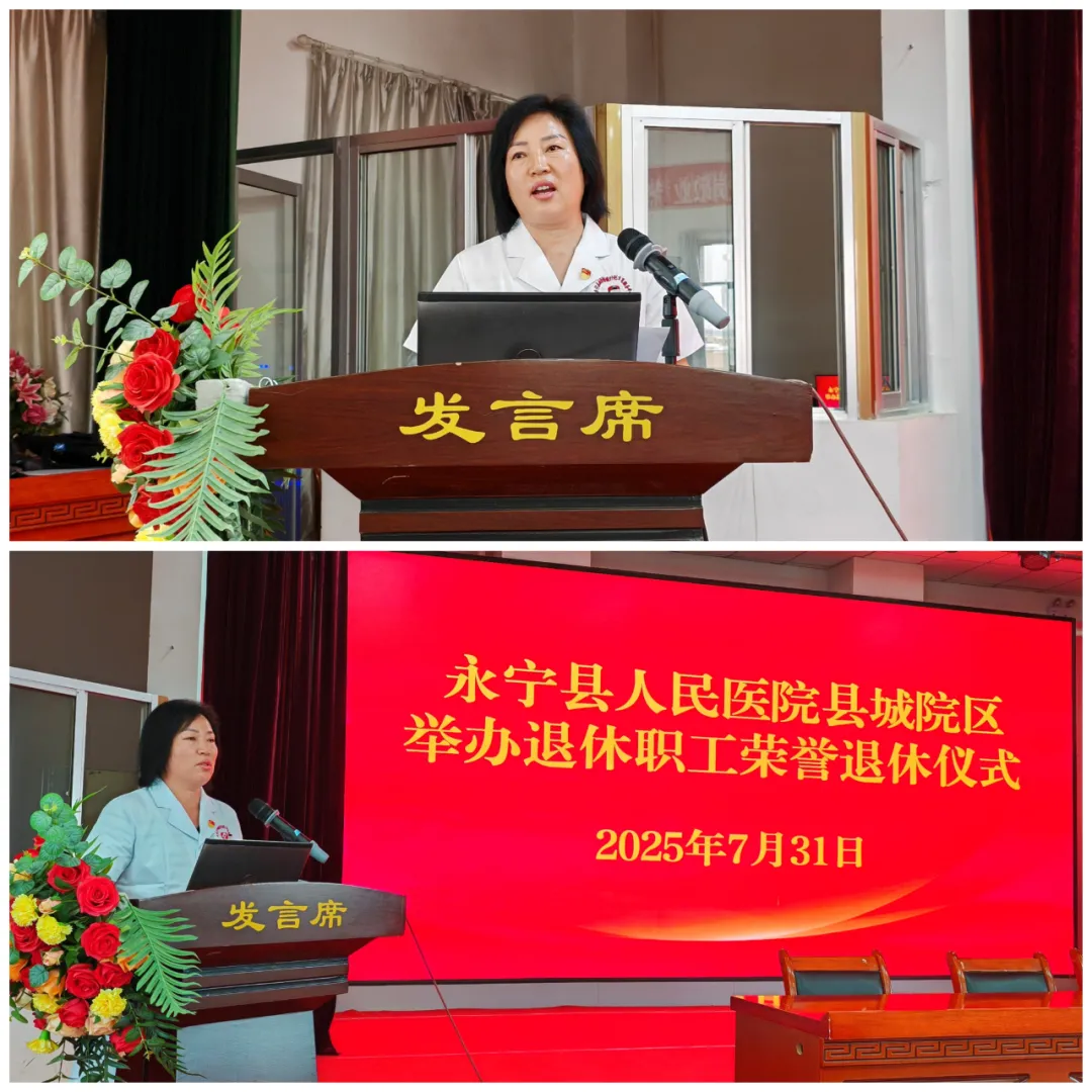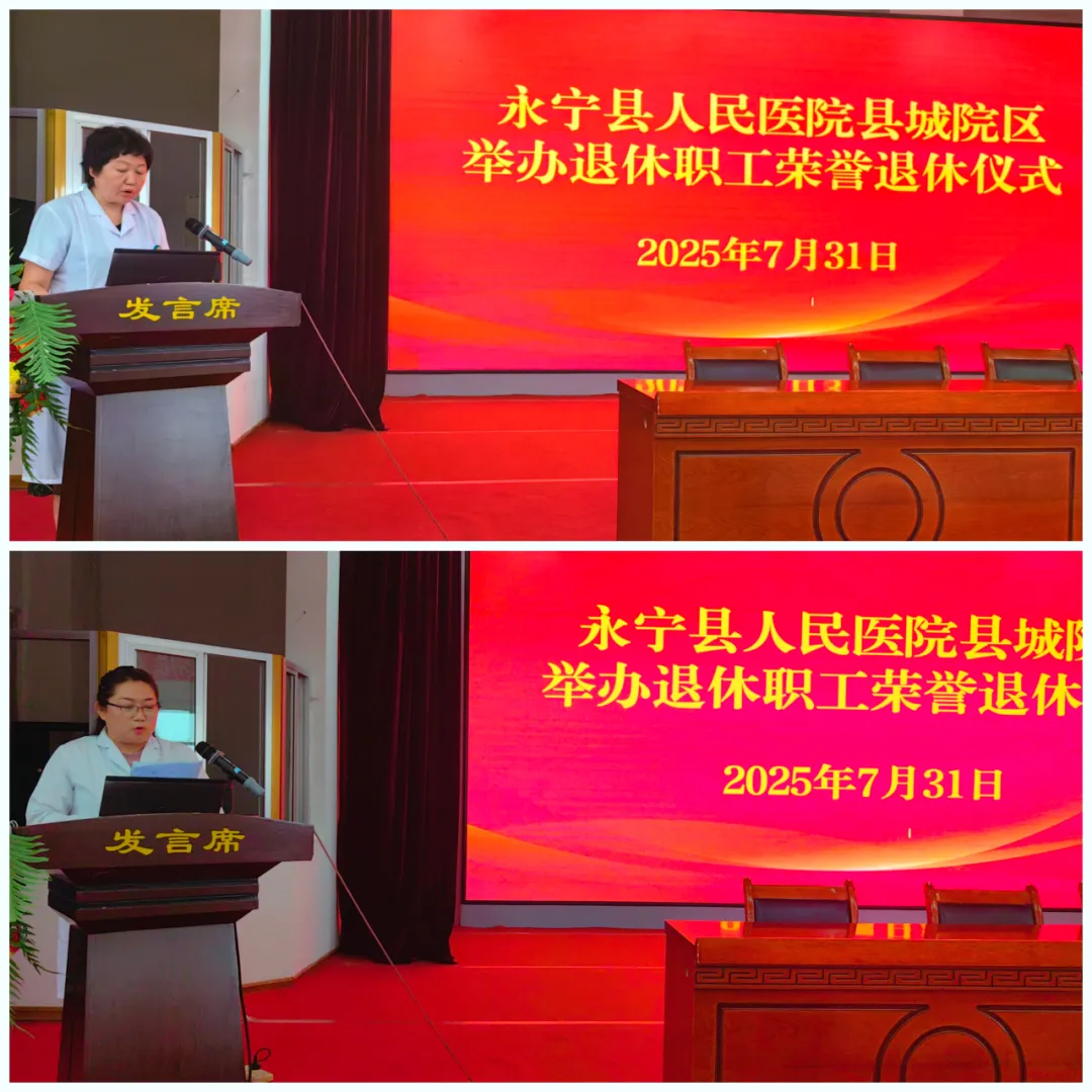 岁月流转,致敬奉献。为表达对退休职工的崇高敬意与诚挚感谢,传承医院“敬佑生命、敬业奉献”的文化精神,7月31日,永宁县人民医院县城院区隆重举办2025年退休职工荣誉退休仪式。院领导班子成员、全体中层干部齐聚一堂,共同见证这一温馨而庄重的时刻,向为医院发展奉献了宝贵青春的吕涛、沈丽萍两位同志送上最真挚的祝福。荣退仪式由县城院区副院长王立华主持。